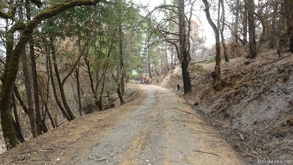 All the big trucks and bull dozers drove up an down this old paved road and pretty much chewed up the old pavement that was mostly shot before the fire. I think maybe they’ll get some new much needed pavement out of this fire. I could see more state park workers up ahead.![]()
