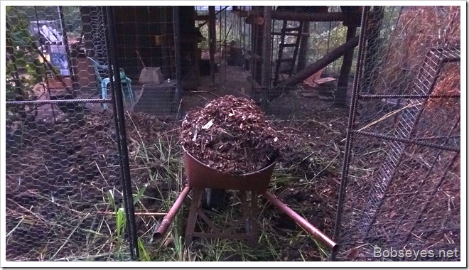 By now it was getting late but I had one more thing I wanted to do and that was to turn the soil in one of my grow pens and put a couple more loads of woodchips in it for the chickens to scratch in and mix up for me.
