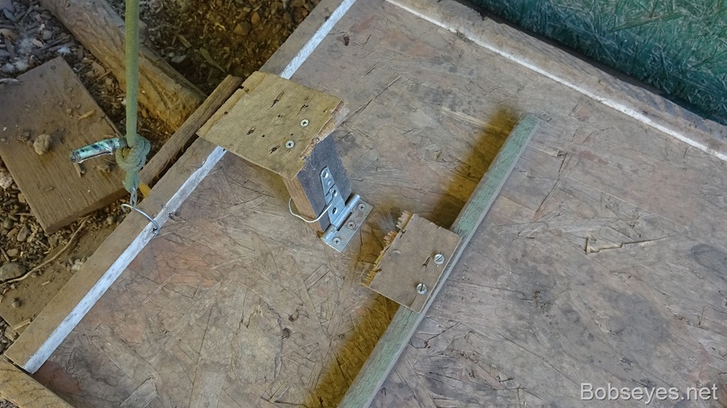 Finding the little board took the longest but once I found one I screwed it together and it was fixed. The chickens stand on the trigger and it opens. There’s a weighted can on a pulley above that opens the door when the latch is triggered.![]()