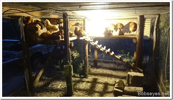 The light is to make the daylight longer to improve the number of eggs I get as this time of year they go into molt and my egg production goes way down and light is supposed to improve the number of eggs by making the daylight longer. It does seem to work as I went from 5 eggs a day to 8 or even more on some days.