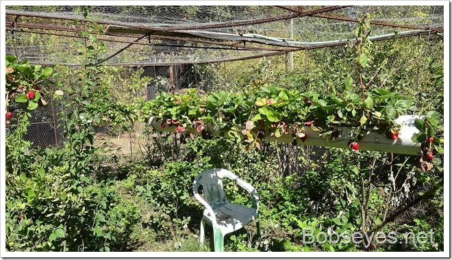 I wanted to fertilize these strawberry plants and the blueberry plants also but I figured I better harvest the strawberries first as that stinky fish stuff would likely ruin them.berries