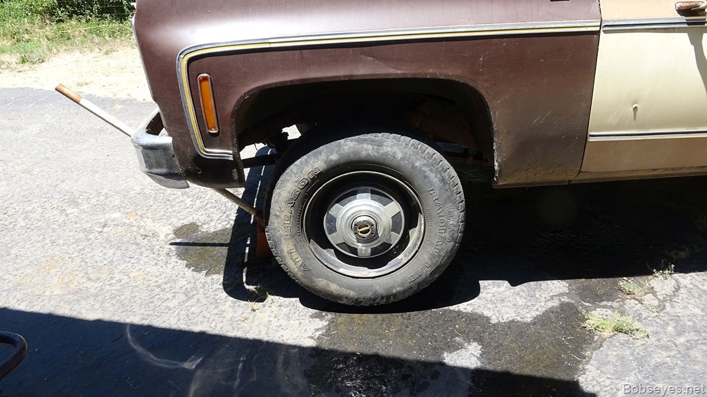 While I was thinking about that my brother’s truck also needed some attention. Seems he has a noise coming from this tire area. Sounds like metal scraping, so we had jacked it up to have a look. I found the wheel could be moved from side to side a tiny bit and thought the bearings was too loose, so I took it apart, but that wasn’t it, no sir it wasn’t.![]()