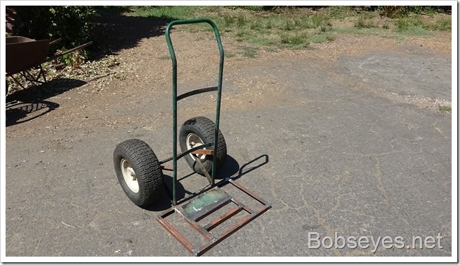 This is the almost finished sack cart. There’s still something that could use some improvement I hadn’t thought about. The cart handle could use about another foot on it to give more leverage when tilting the cart back loaded. It’s doable with how it is but extending the handle would make it easier to use.![]()