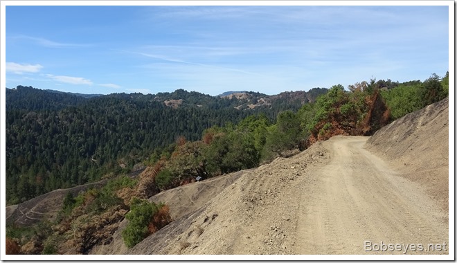 I rode up this rode where you can see where the fire burned. The Pacific ocean is just over those hills. With all the dried out trees the forest is still very dangerous as far as having lots of fuel to restart a forest fire, especially if the wind picks up enough to blow flames into the tree tops. So it’s important to put out and small spot fires that may flare up from burning roots and tree trucks underground.![]()
