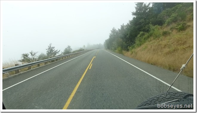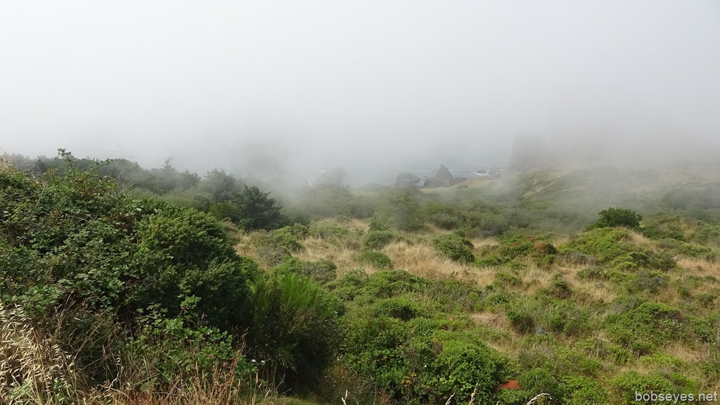 I stopped at my favorite camping spot on the way to have a look down below the road to the ocean. I plan to hike down through this area to the ocean one of the days I’m here. I want to have a look at the rocks for possible fishing. That’s the ocean in the background fogged in.![]()