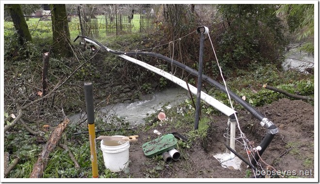 I put Iggy down in the creek to lift the pipe up while I pulled the cable but no go. The pipe was full of water and we couldn’t get it very high up in the air. Just about that time Steve my brothers helper came by so I put them both in the creek lifting the pipe which they could barely do. But as they lifted the pipe water flowed out both ends and it got lighter quick so we all three where able to get the pipe back suspended in the air.