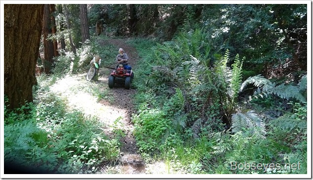 Then I grabbed the chainsaw and we rode up into the hills to cut this tree off the road. Marty is fiddling with the machine’s shifter. I got the tree cut up and Marty helped me move the brush off the road.![]()