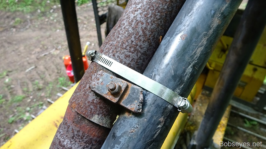 A tree I was pushing tore the exhaust pipe off the other day breaking the bracket that held it on. I brought the clamp up to repair it and put it on to hold the pipe in place.![]()