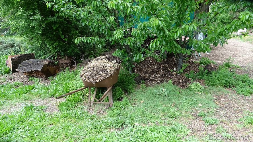 So anyway, I decided to put some more mulch on the cherry trees so I hauled about six loads of woodchips to the trees and dumped them.![]()