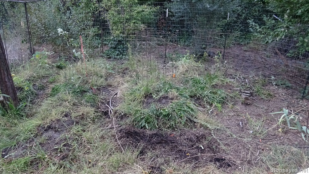 I bought 4 rhubarb plants this spring and planted two in two different places. Two of them grew really well, those on the left. But two of them didn’t do well so I moved them with the ones that did well. The ones on the right didn’t do well growing this summer for some reason. I let the chickens in this pen the other day and they really did a job on the rhubarb leaves. I guess I’ll have to protect the rhubarb before I let them in here again.![]()