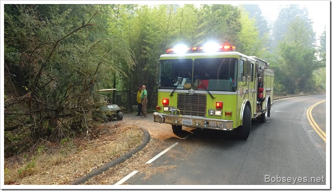 My brothers were standing on the road when a CAL Fire pickup drove up and stopped. It was the head guy. He had some map questions and wanted to go up into the hills which could be confusing for someone not in the know. I noticed his passenger seat was empty so I said I have just what you need. Barry. Take him with you as he knows what you need to know so they took off.