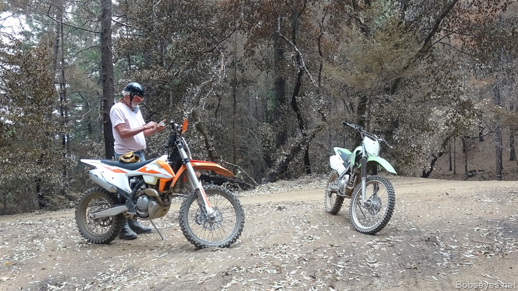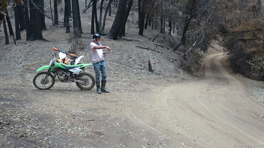 I had planned to go up into the hills and work on the old hermit’s spring but my brother Barry called about 11 and wanted to go for a dirt bike ride up where the forest fire burned. Right now every body’s gates are open so we can ride around most of the places near us. I know some of the people but not all of them. And a lot of them I just met during the fire and most of those people know me by name but I’m not so good on their names as with age I can’t seem to remember names very well and even faces I’m not too good at for some reason.
