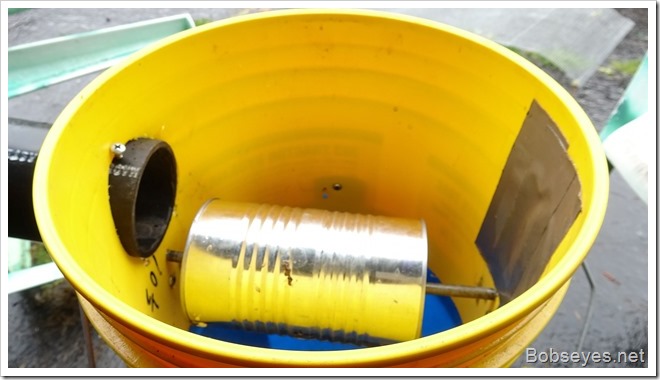 After that I got my quart can and drilled a hole in the center of each end and mounted it in my mouse/rat trap. I think it will work better than the plastic bottle as it has more mass. I will put a bit of peanut butter on the can near the middle to attract the critters. I also mounted the can higher as they don’t appear to like to jump down on things. It’s hard to tell but the end of the can is about an inch and a half above the bottom of the black entrée pipe so now they have to hop up onto it. The idea is they get up on the can to eat some peanut butter and the can turns and they fall down into the bucket. Some water in the bottom of the bucket does them in. I put the bucket up in my house attic for now as I can hear some activity up there.![]()