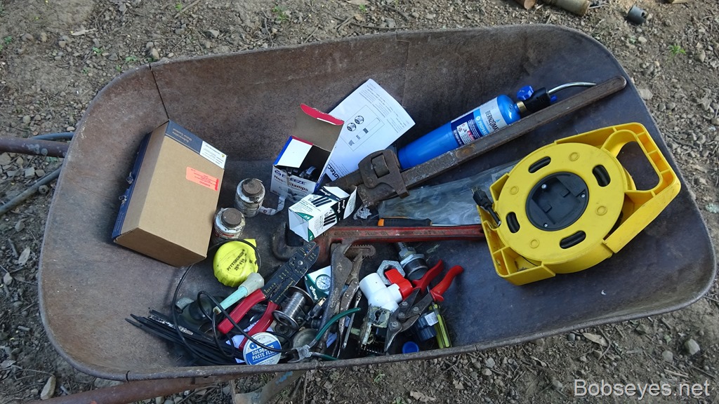 I really underestimated just how many tools I’d need to do the job at the beginning and at the end of the day there were about twice as many tools in the wheelbarrow as when I started. It seems there’s a lot of things that need done to hook up a well pump.![]()