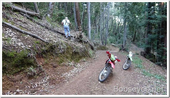 We rode over to another spot and were about to leave when Barry said he saw some Lion’s Mane up by a downed tree on the ground so we stopped and he climbed up the hill to have a look.log5