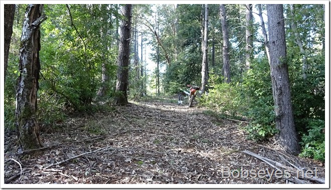 Barry was riding through here looking for mushrooms when he got stuck on that little tree and had to get off and pull his bike back off it. Good place for mushrooms but there where none in this spot.bike8